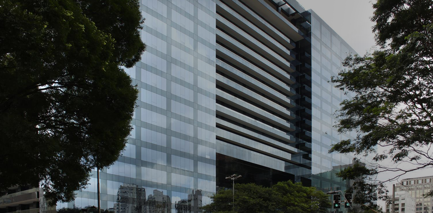 com fachadas de vidro e proteções de placas metálicas perfuradas em tons de cinza.